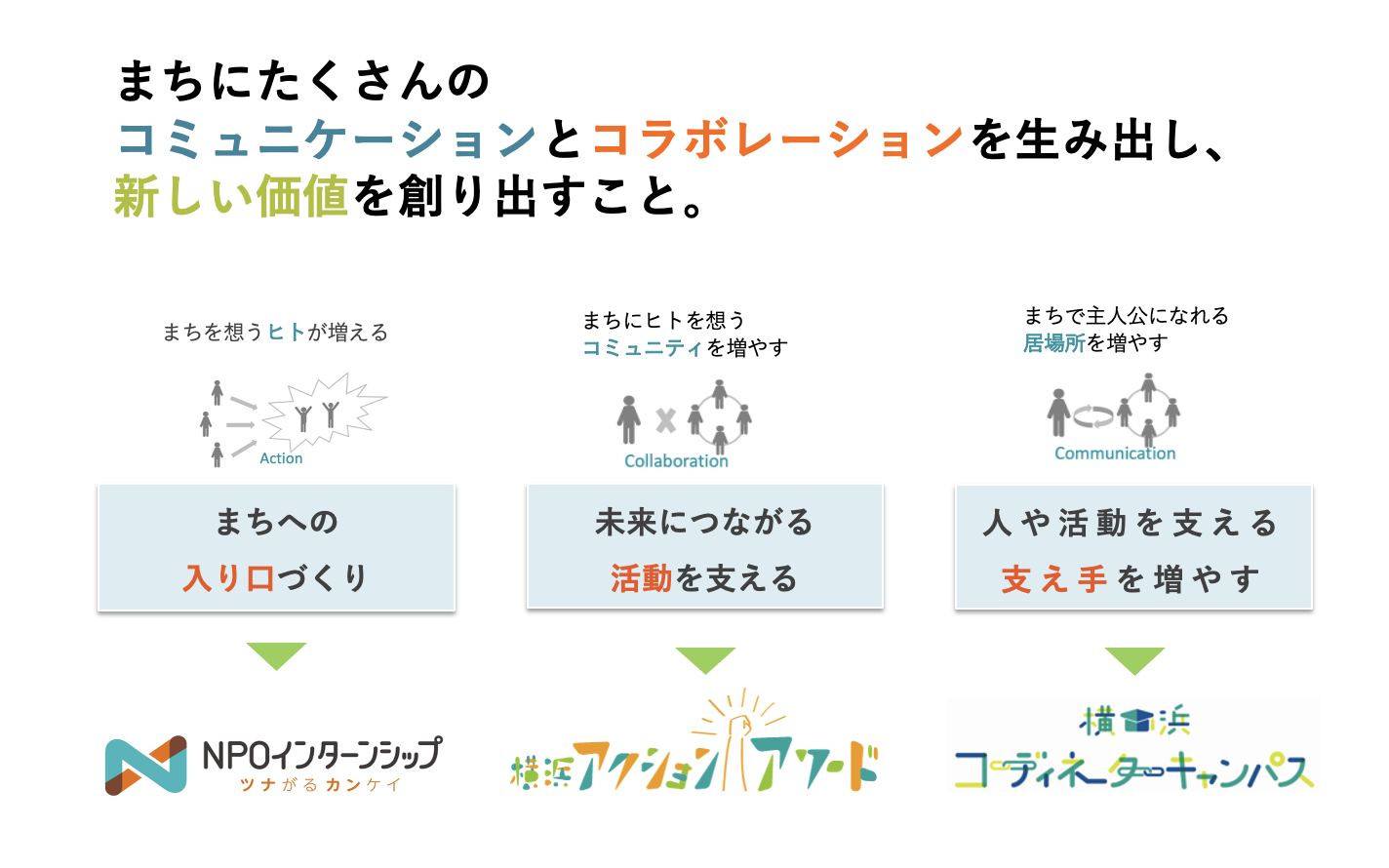 アクションポートでは大学生を始めとした若者が中心となり、NPOや企業、行政、まちの皆さんと連携しながら地域の課題解決や活性化に繋がる様々な活動を運営していきます。